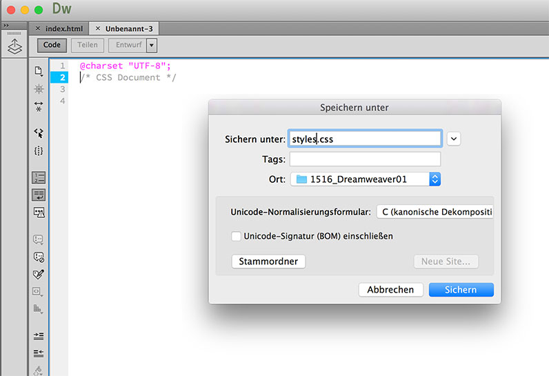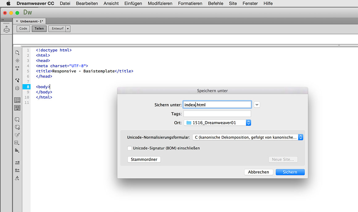 1. Im ersten Schritt legen Sie die html-Startdatei an. Öffnen Sie ein neues Dokument und wählen Sie als Dokumenttyp html5. Vergeben Sie im head des Dokuments einen Titel uns sichern Sie das Dokument unter dem Namen index.html in dem Verzeichnis, das Sie für die Website eingerichtet haben.