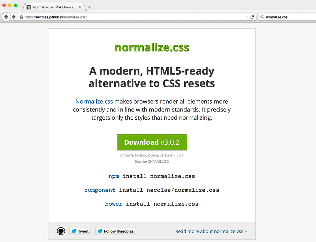 2. Es geht dann mit der Erstellung und Anbindung der Stylesheet-Dateien weiter. Zuerst müssen die Standard-Einstellungen des Browsers zurückgesetzt werden, damit Sie nicht in das Layout Ihrer Website übernommen werden. Dies kann nämlich zu unkalkulierbaren Verschiebungen der Elemente führen und ist nicht anders in den Griff zu bekommen, als die entsprechenden Wertangaben erst einmal um Null zu setzen. Das Rad müssen Sie aber nicht neu erfinden, denn es gibt im Netz eine Vorlage, die heruntergeladen und mit dem eben vorbereiteten html-Dokument verknüpft werden kann: https://necolas.github.io/normalize.css/