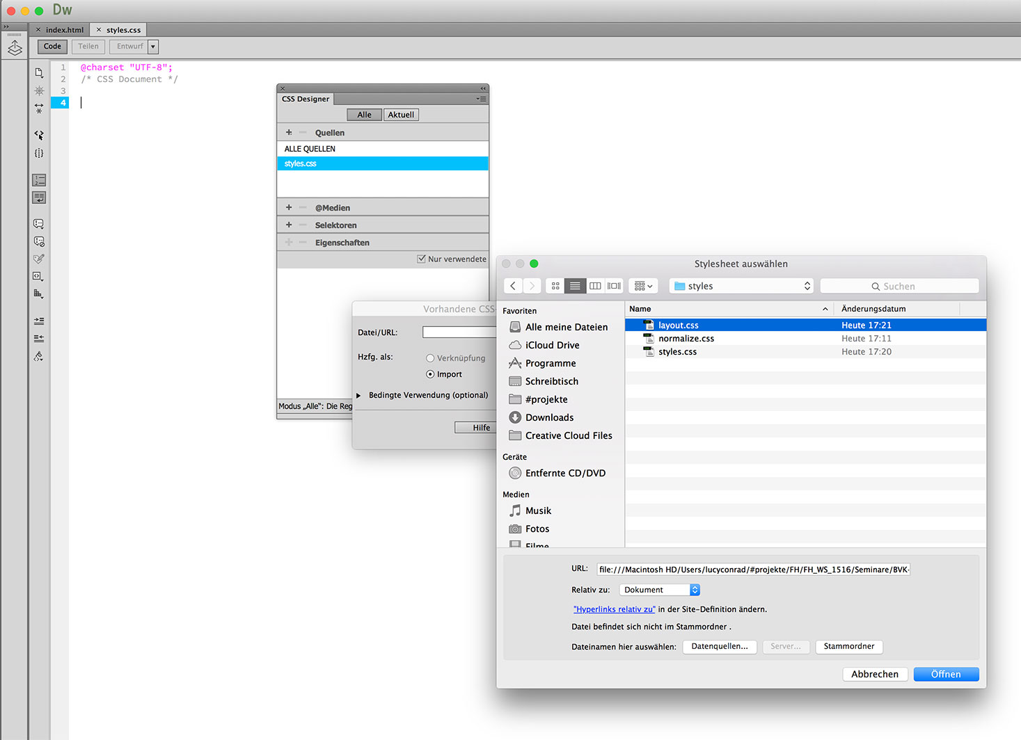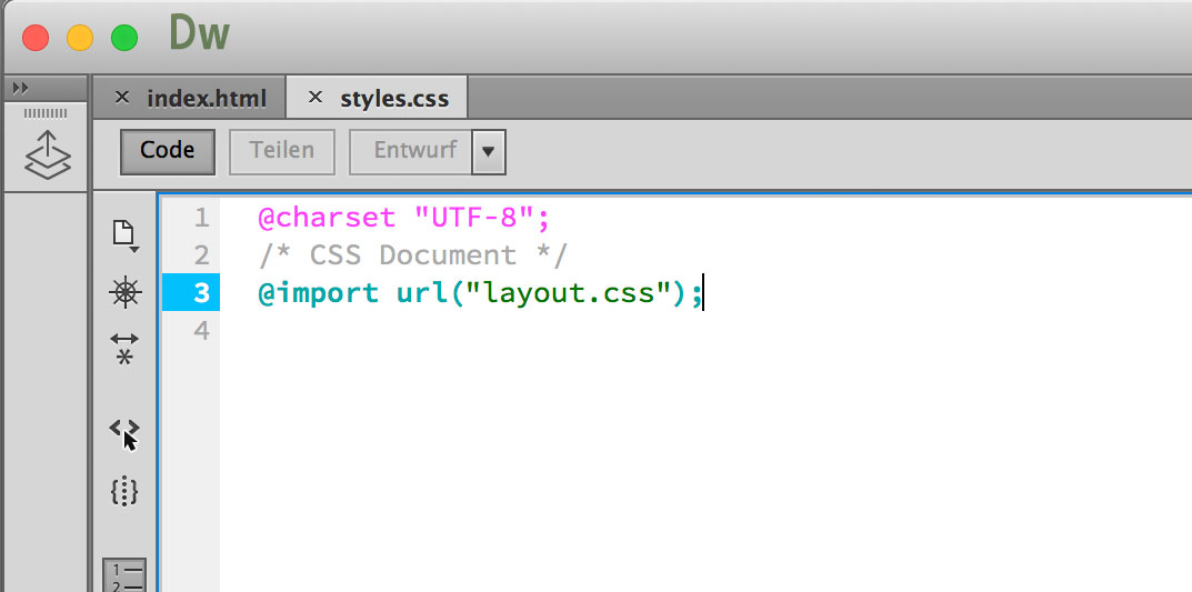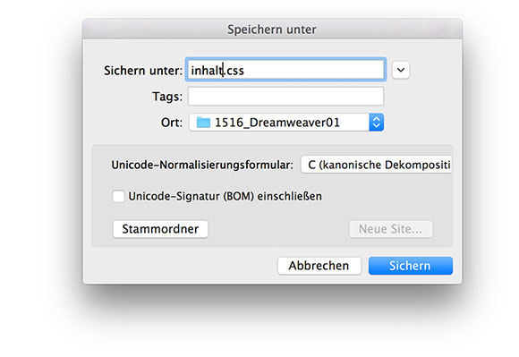 Erstellen Sie danach zwei weitere Stylesheet-Dateien - layout.css und inhalt.css und importieren Sie die beiden Dateien in die Datei styles.css. Danach können Sie in den untergeordneten Dateien die Grundeinstellungen für das Layout und die Detail-Formatierung für alle Inhalte einfügen und dabei leichter den Überblick behalten. Die Normalisierungs-Datei wird übrigens besser nicht untergeordnet, sondern sie wird direkt mit der HTML-Datei verknüpft. Und das haben Sie ja bereits gemacht...