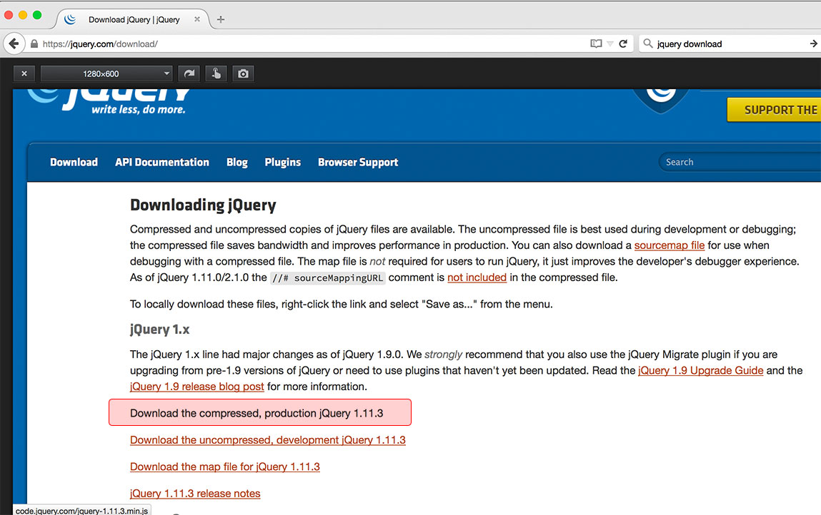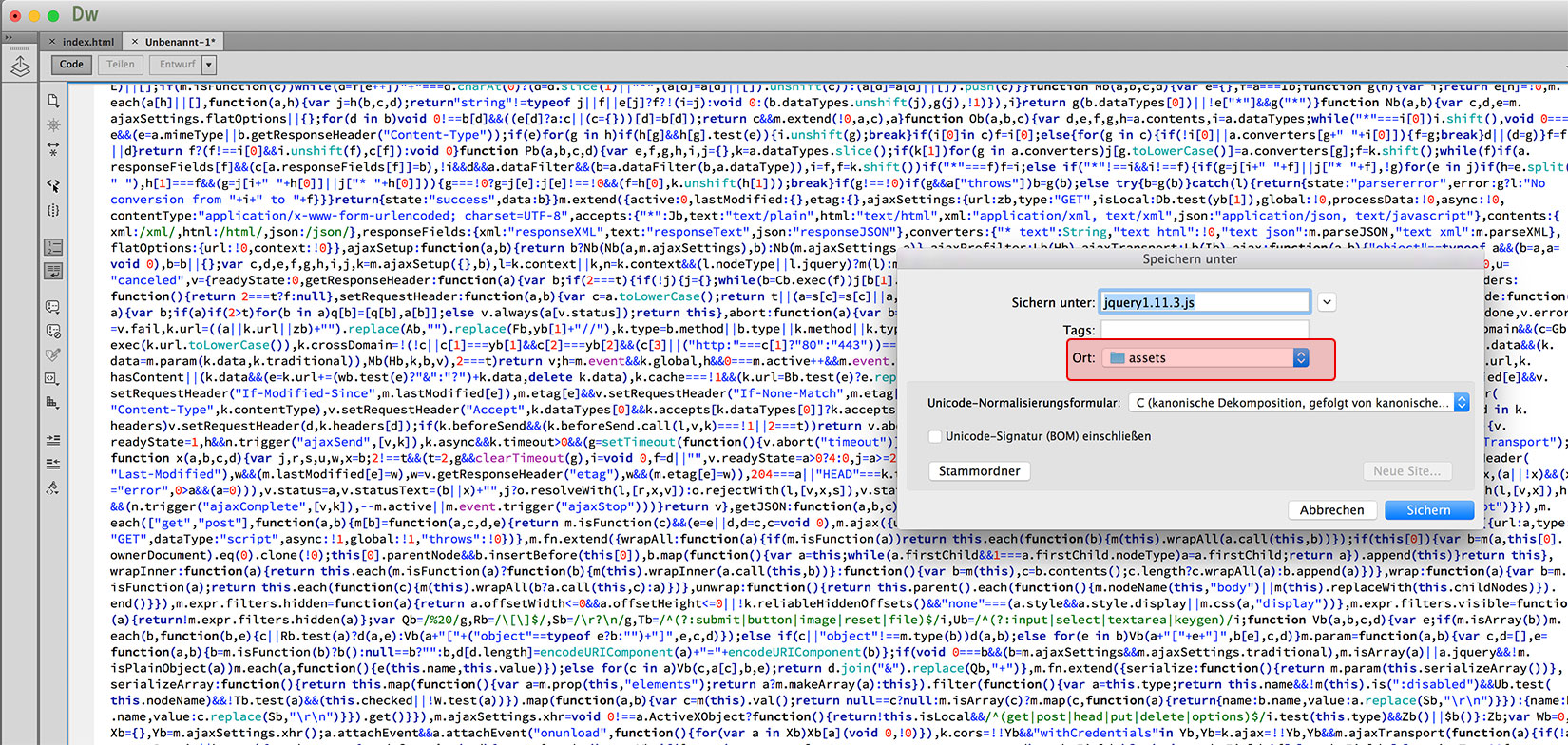 5. Da für Erweiterungen von Websites fast aussschließlich jQuery-basierter Code und Plugins eingesetzt werden ist es sinnvoll, das Framework gleich zu Beginn zu integrieren und dabei lokal zu sichern. Laden Sie die aktuelle Version von jQuery aus dem www und sichern Sie den Code in einer JavaScript-Datei in Ihrem assets-Verzeichnis.