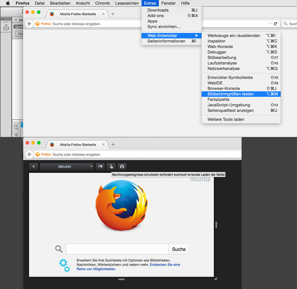 Darüber hinaus ist es für responsive Website unbedingt erforderlich, die unterschiedlichen Größen der Ausgabegeräte zu testen und dafür eine lokale Vorschau einzurichten. In moderenen Browsern können Breakpoints durch Ändern der Fenstergröße aufgerufen werden, für die Simulation von touch-Events muss man dann allerdings entweder ein Testgerät benutzen oder einen lokalen Simulator z.B. über xCode einrichten.
