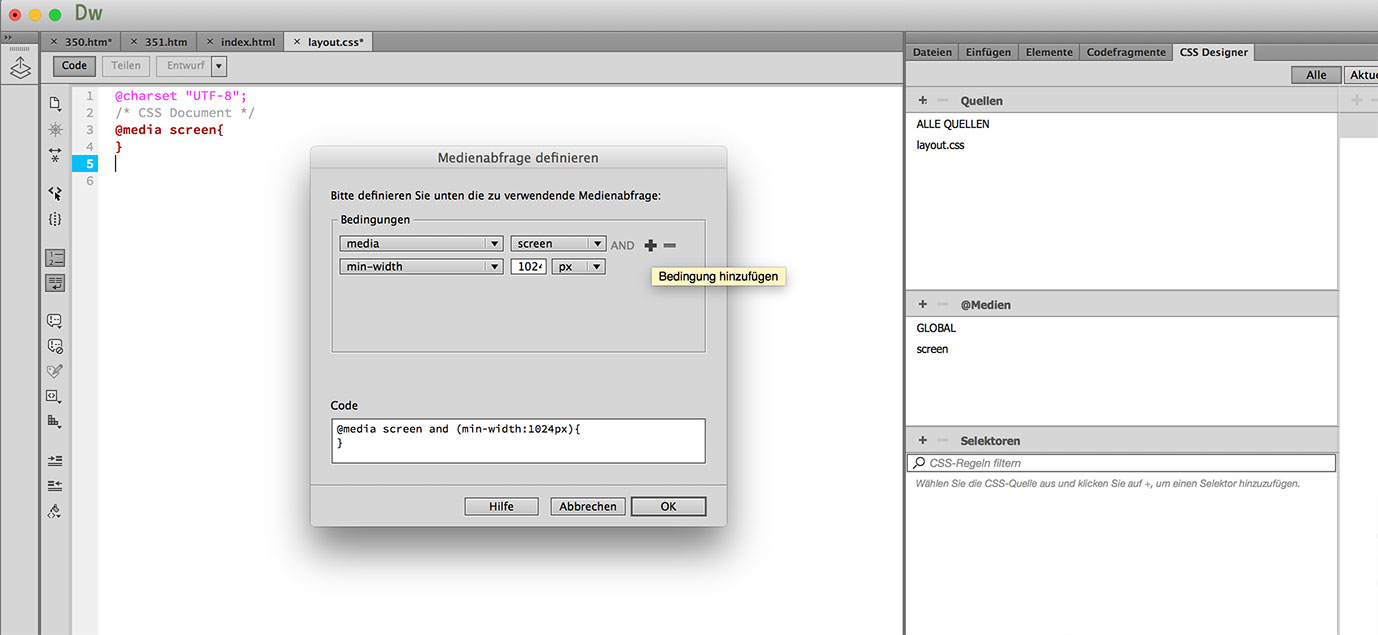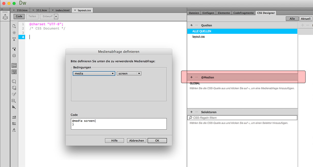 2. Wechseln Sie anschließend in die css-Datei layout-css und legen Sie zwei Breakpoints für die Viewports Mobile und Desktop an.