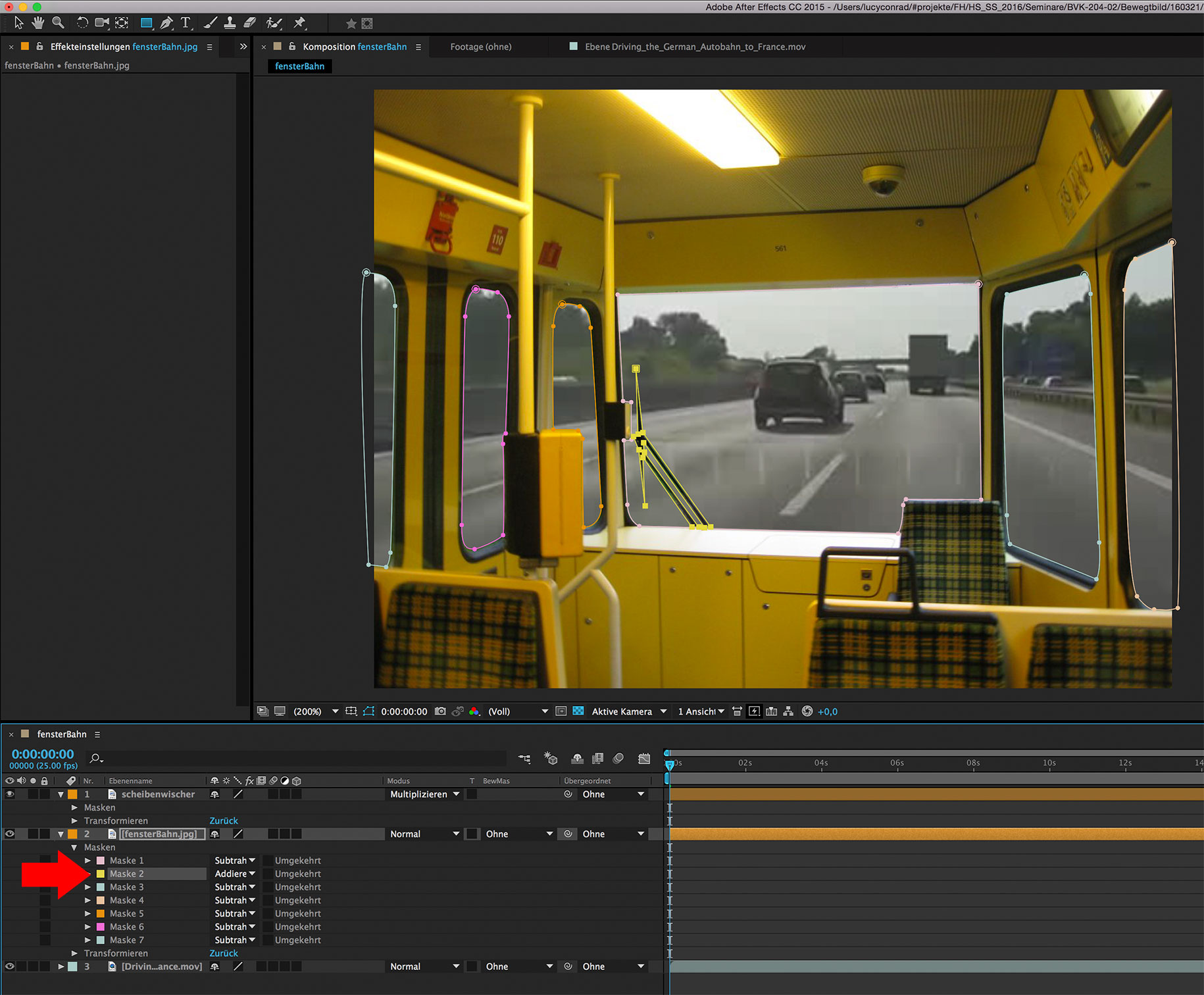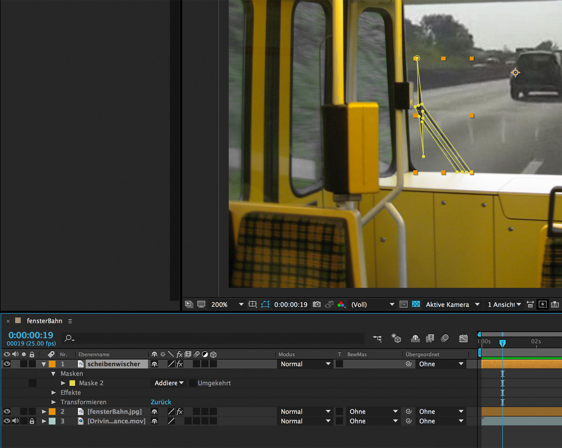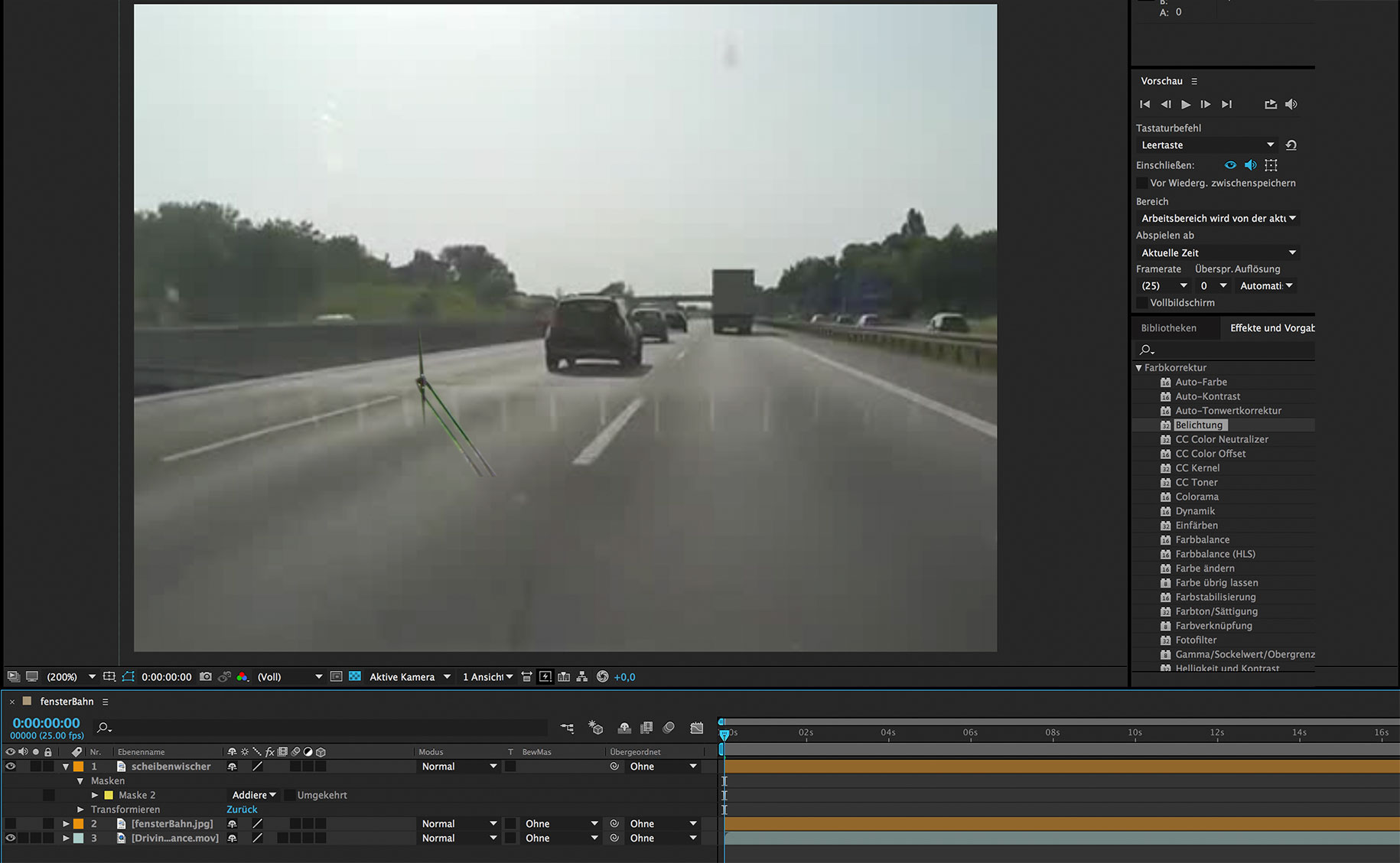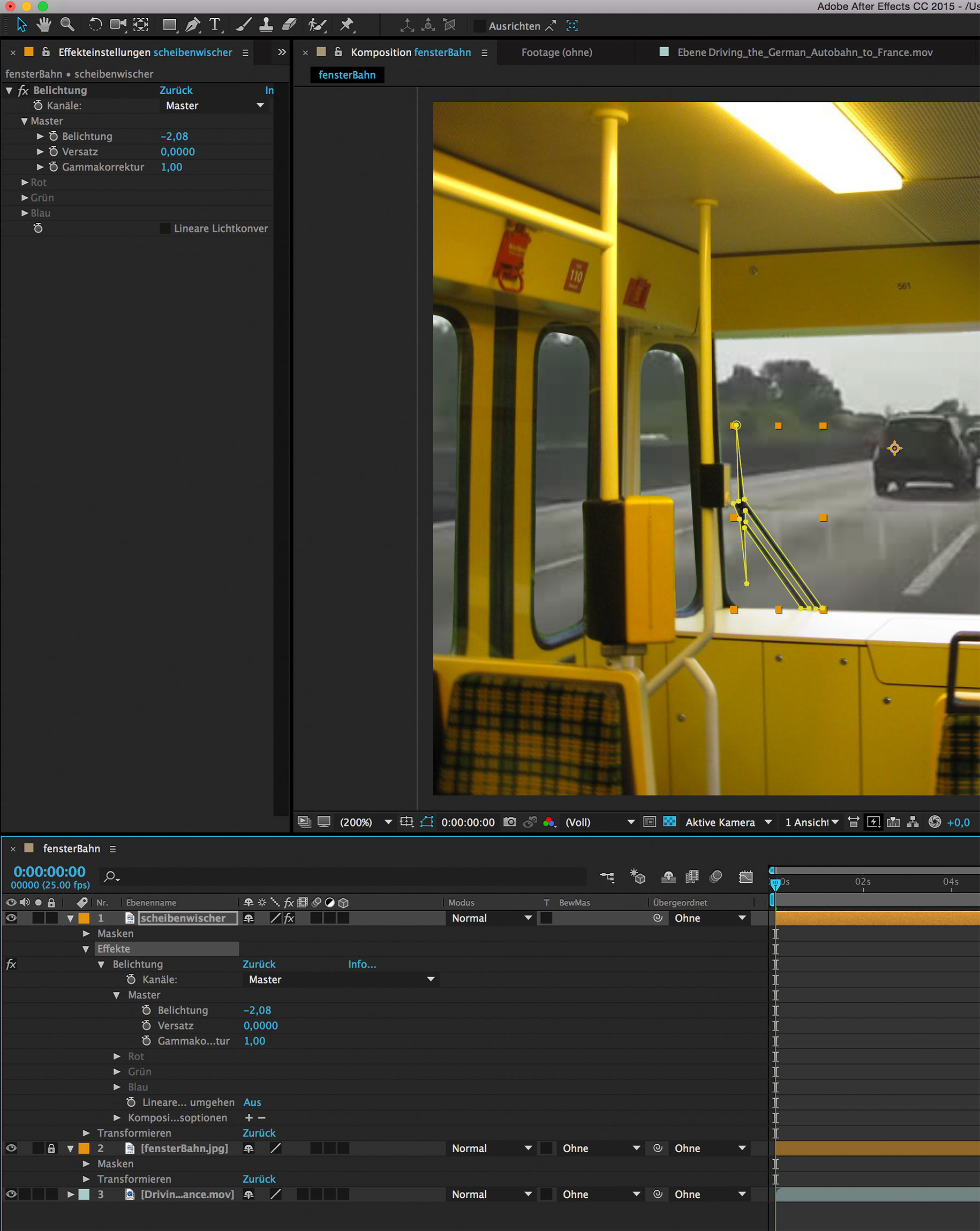 Dadurch erhält man zwei voneinander getrennte Ebenen und der Scheibenwischer kann mit einem Effekt dunkler eingestellt werden. Im Beispiel wurde die Farbeinstellung Belichtung gewählt. Zu Schluss wird noch die Scheibenwischer-Maske aus der Original-Bahnebene entfernt, damit keine unerwünschten Überblendungs-Effekte entstehen.