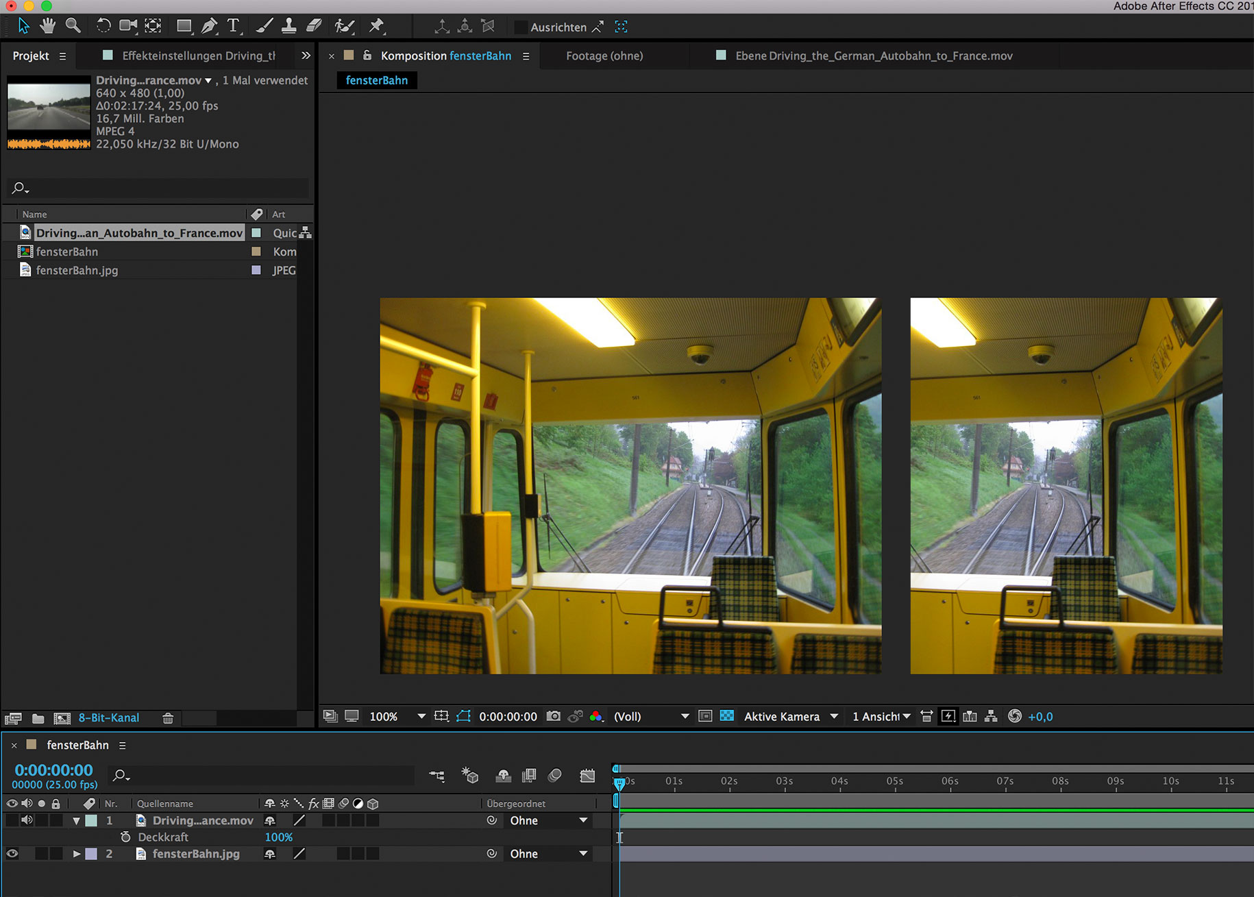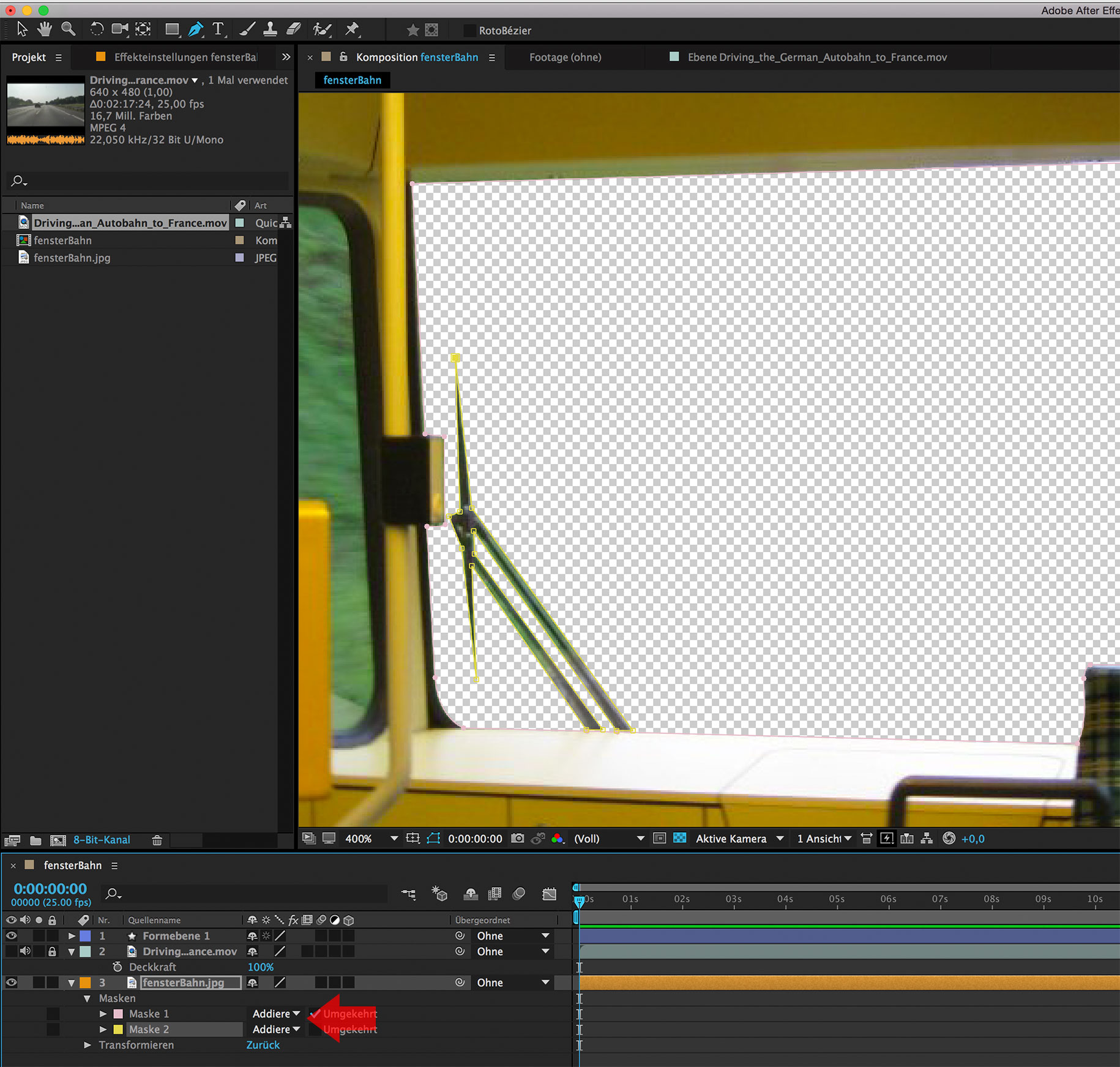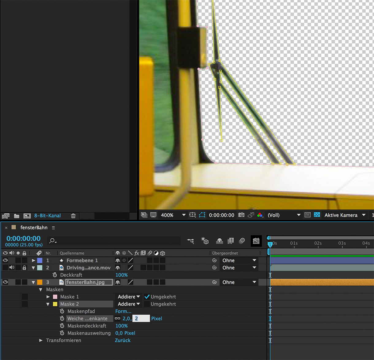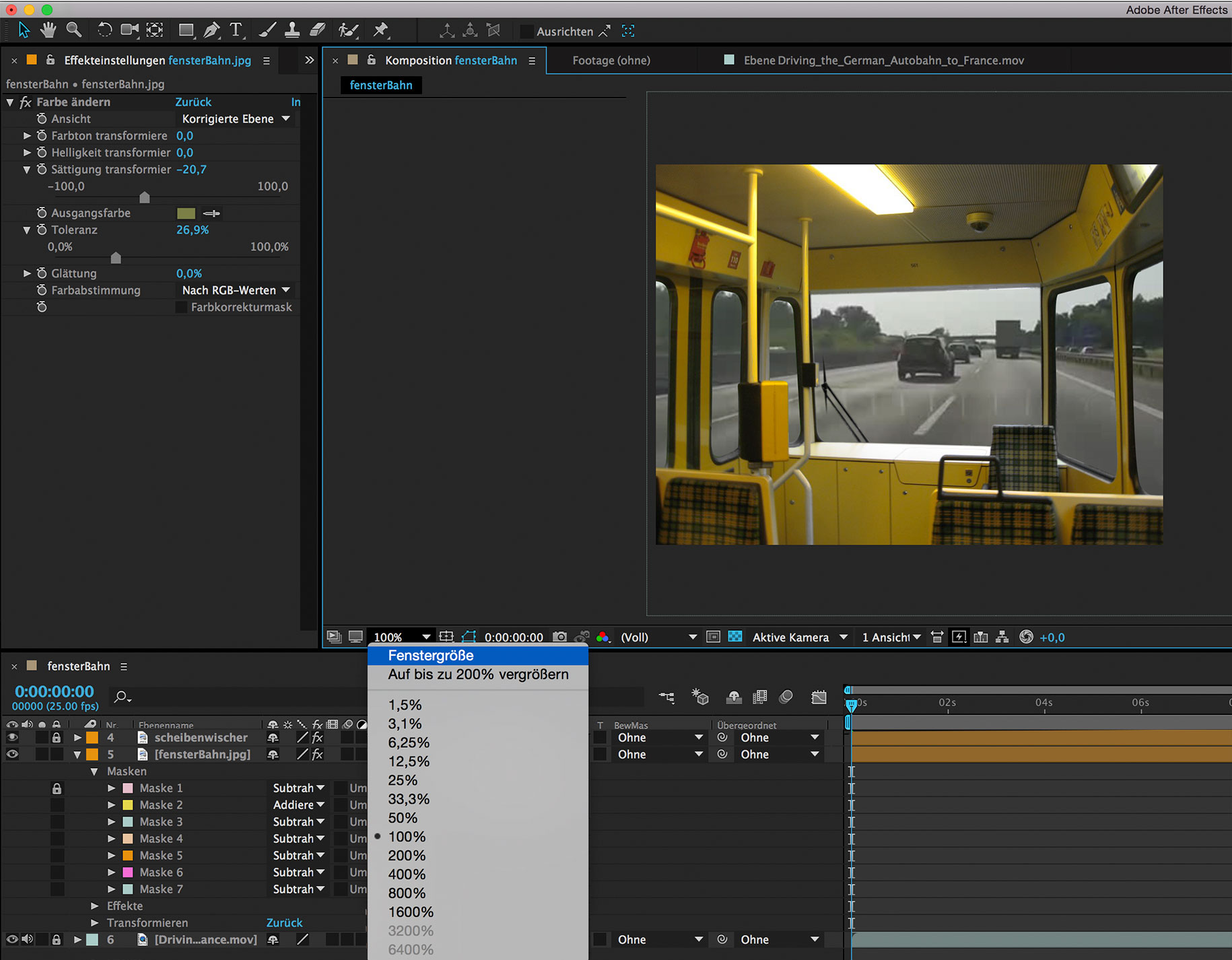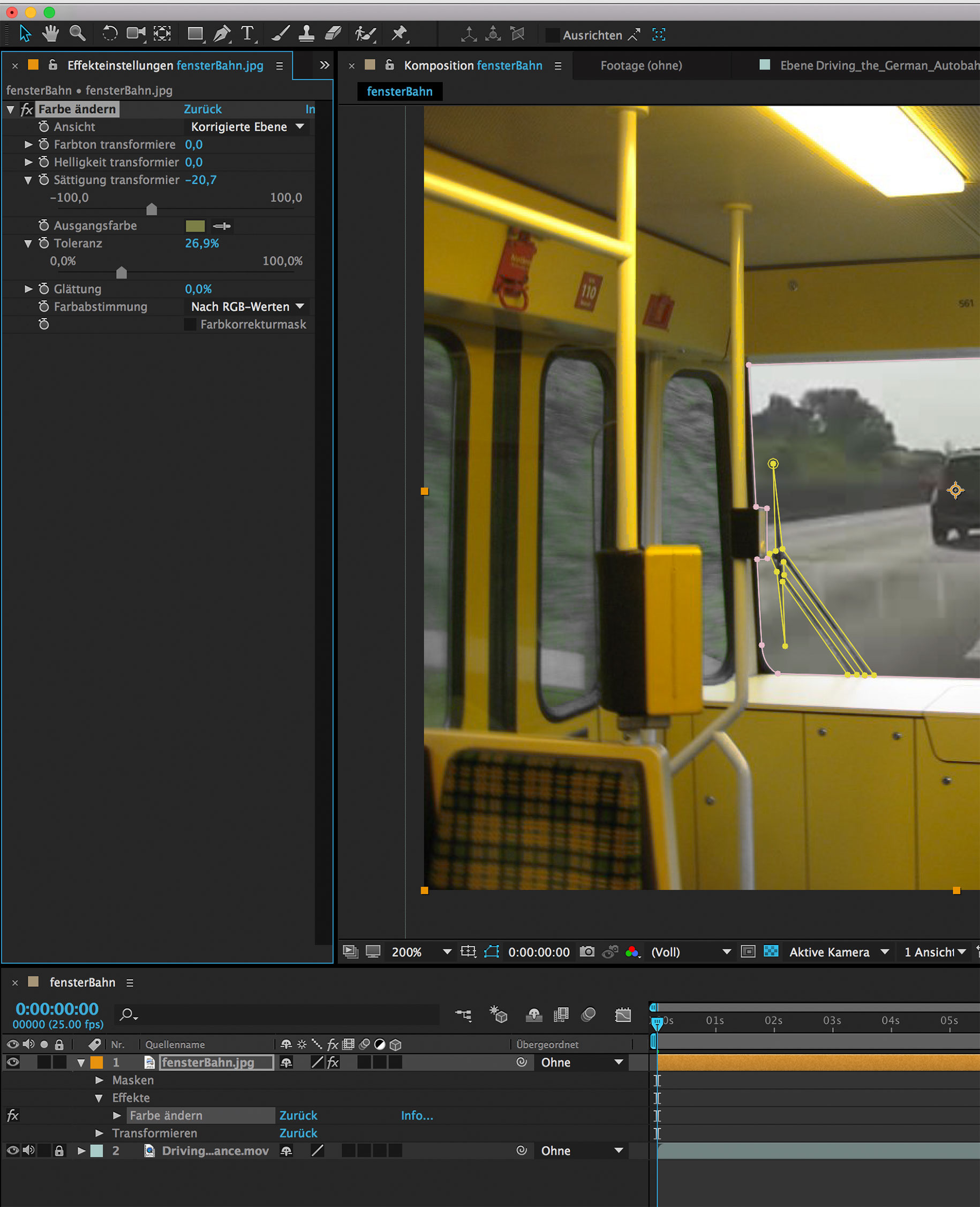 Dadurch erhält man zwei voneinander getrennte Ebenen und der Scheibenwischer kann mit einem Effekt dunkler eingestellt werden. Im Beispiel wurde die Farbeinstellung Belichtung gewählt. Zu Schluss wird noch die Scheibenwischer-Maske aus der Original-Bahnebene entfernt, damit keine unerwünschten Überblendungs-Effekte entstehen.