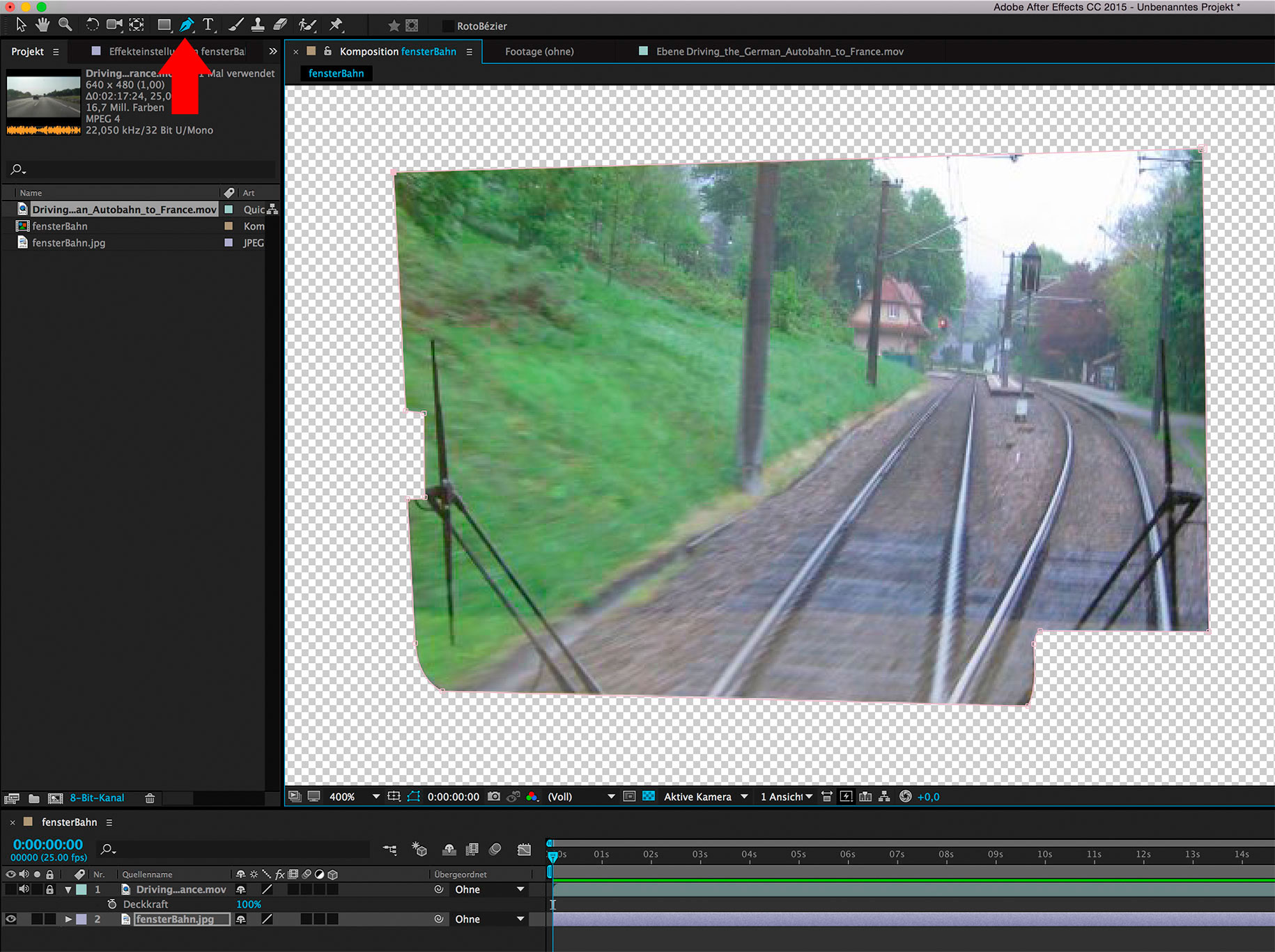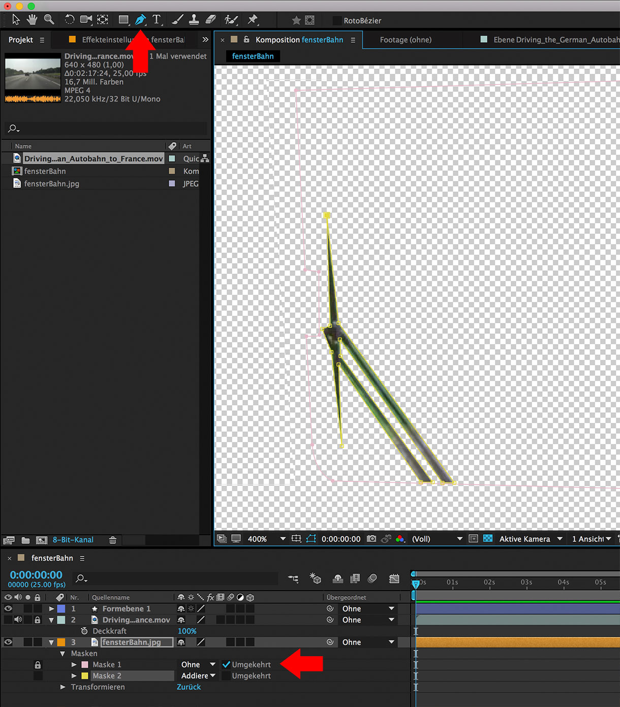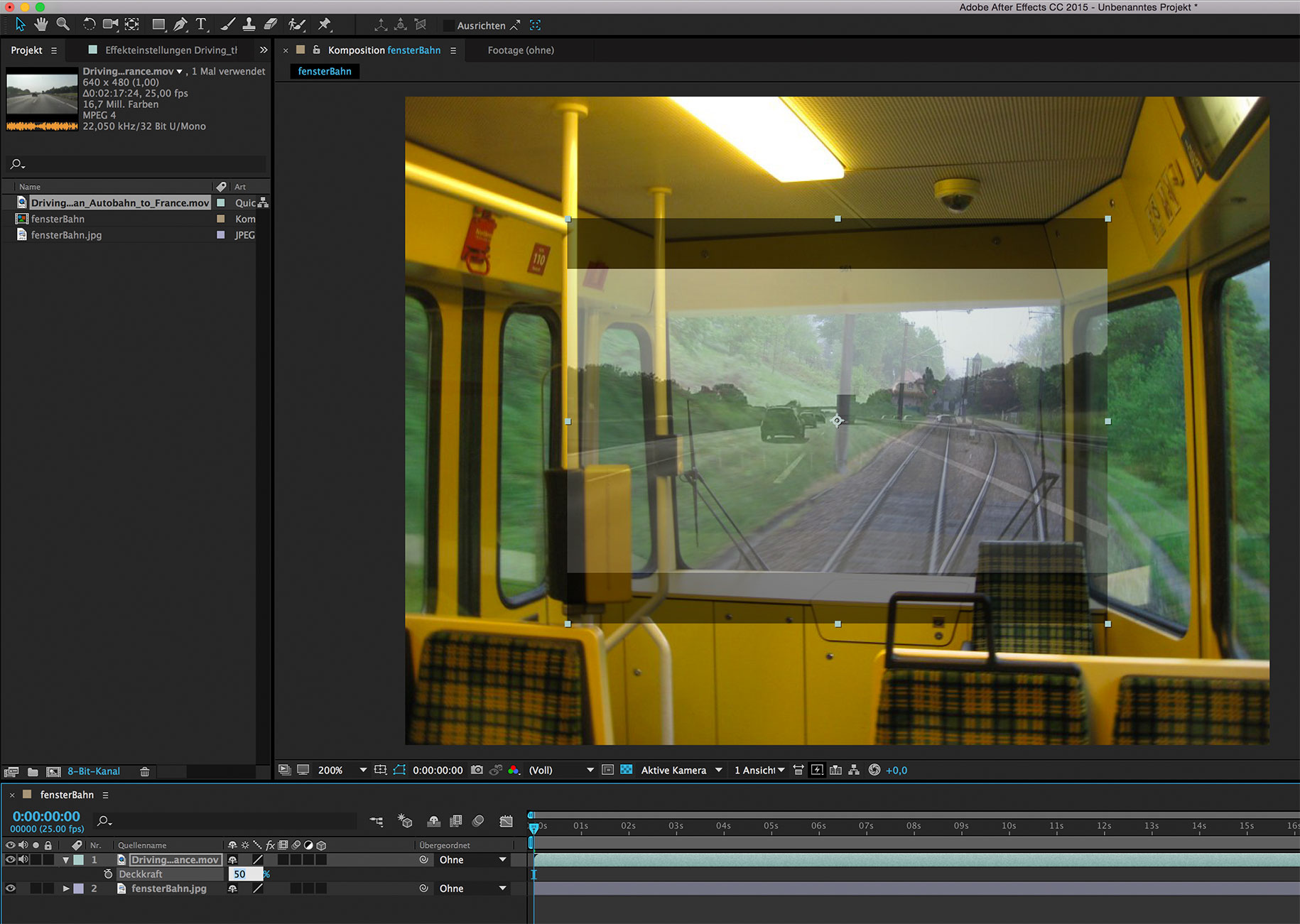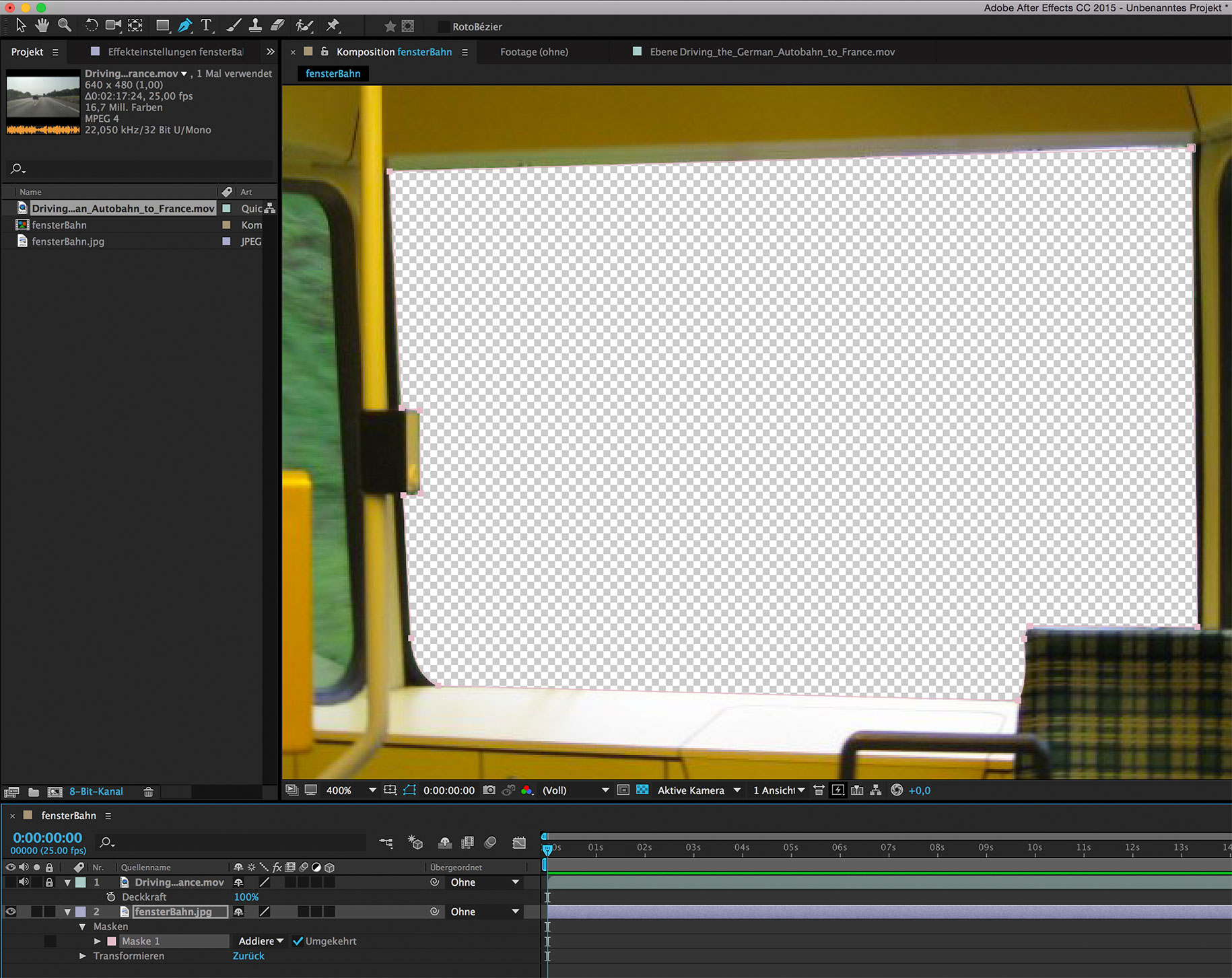 Dadurch erhält man zwei voneinander getrennte Ebenen und der Scheibenwischer kann mit einem Effekt dunkler eingestellt werden. Im Beispiel wurde die Farbeinstellung Belichtung gewählt. Zu Schluss wird noch die Scheibenwischer-Maske aus der Original-Bahnebene entfernt, damit keine unerwünschten Überblendungs-Effekte entstehen.